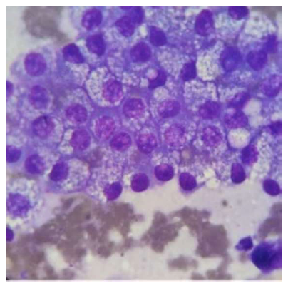 Figura 4 Histopatología de testículo derecho y citología de próstata en un canino Beagle de 8 años diagnosticado con sertolinoma maligno. Vista microscópica en 100x (Coloración Wrigth) de células epiteliales glandulares con forma cúbica, tamaño similar, citoplasma básofilico, nucleo central y redondo (Tunja, Colombia)