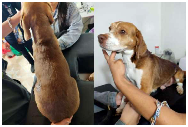 Figura 5 Canino Beagle de 8 años diagnosticado con Sertolinoma maligno tres meses después de orquiectomizado (Tunja, Colombia)