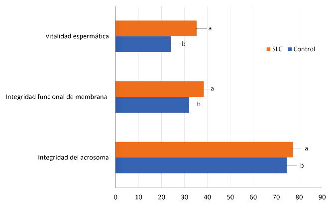 Figura 1. Evaluación de la membrana plasmática de espermatozoides de Cuniculus paca (n=20). SLC: Centrifugación con gradiente de densidad de una capa. Los resultados se presentan como media ± error estándar. Las medias con diferentes superíndices dentro de una misma fila indican diferencias significativas (p<0.05)