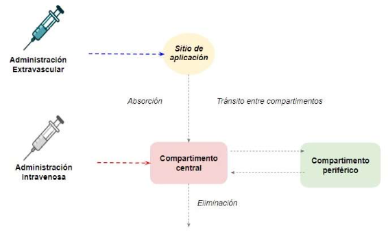 Como se ejemplifica en el modelo anterior, los principales parámetros farmacocinéticos de los modelos compartimentales son la constante de absorción (Ka), que describe la velocidad a la que se absorbe el fármaco desde el sitio de aplicación hacia la sangre; el volumen de distribución (Vd), que representa la distribución del fármaco inicialmente en un compartimento central y, posteriormente, en compartimentos periféricos; y Clearance (Cl), que representa la eliminación del fármaco (Fan y de Lannoy, 2014).