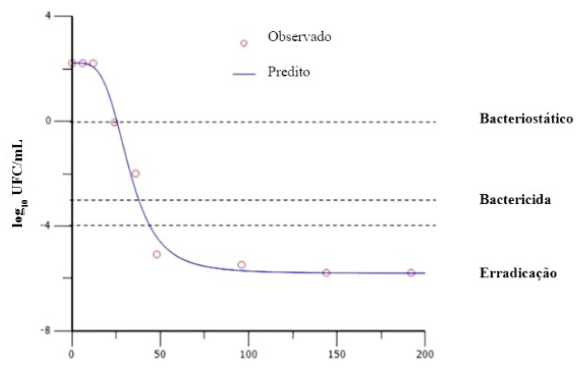Para determinar el índice PK/PD más adecuado es necesario realizar un ensayo de curva de muerte en caldo Muller-Hinton o plasma/suero, leche, entre otros, dependiendo del agente a estudiar (Zhang et al., 2022). Así, el efecto del antibiótico (reducción del conteo bacteriano, expresado en unidades formadoras de colonias - UFC) es evaluado por un modelo matemático a través de la ecuación de Hill, describiendo un modelo Sigmoid Emax (Ecuación 1:E=E0 + (Emax*XN)/ECN 50+ XN), durante 24 horas de tratamiento (Lees, et al., 2004; Mouton et al., 2012).