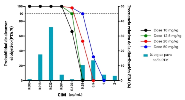 Aspectos microbiológicos: distribución de la población de CIM y curva de muerte bacteriana, que apoyará el conocimiento de la relación entre exposición y efecto antimicrobiano;