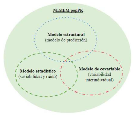 Los modelos PopPK están compuestos por datos, modelo estructural (describe la concentración x tiempo), modelo estadístico (describe la variabilidad residual), modelo de covariables y el software responsable del modelado (Mould y Upton, 2013; Bon et al., 2018). En general, la estructura del modelo se puede representar mediante el esquema indicado en la Figura 2.