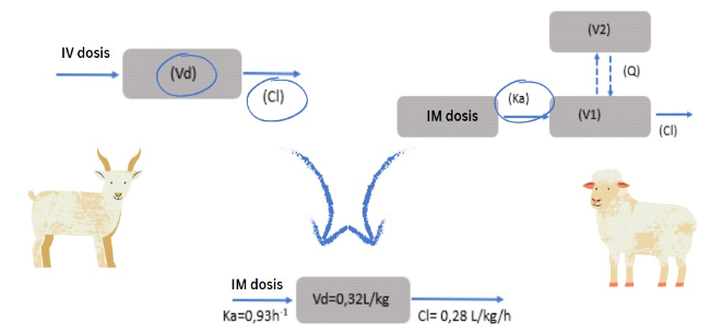 Para ello, los datos de la constante de absorción obtenidos del modelo ovino se integraron con el volumen de distribución (Vd) y aclaramiento (Cl) del modelo caprino, como se observa en el esquema de la figura (Felix et al., 2023).