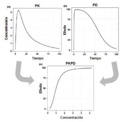 Figura 5. Relación entre modelos farmacocinéticos (PK) y farmacodinámicos (PD). Título: a. Modelo farmacocinético (PK) perfil de concentración en función del tiempo; b. Modelo farmacodinámico (PD) - efecto en función del tiempo; c. Modelo farmacocinético/farmacodinámico (PK/PD): perfil de efectos en función de la concentración.