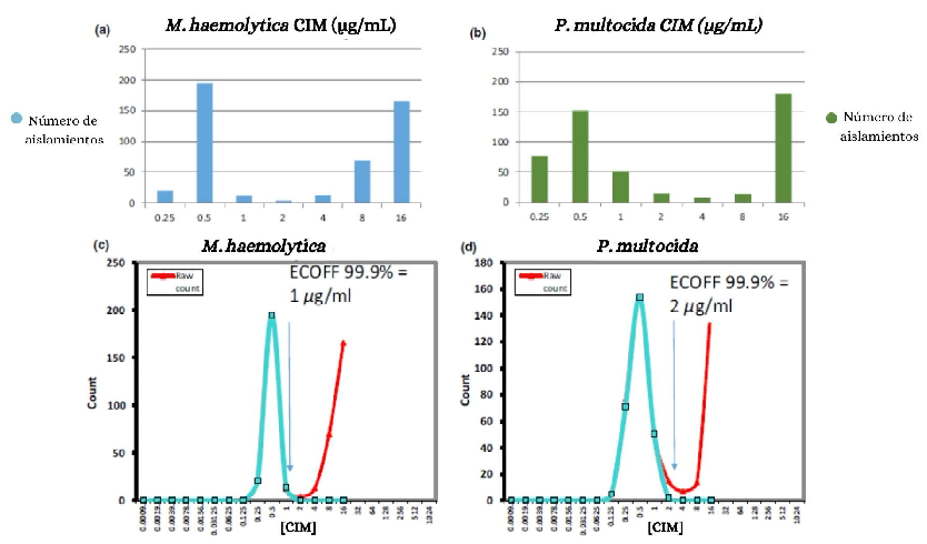 Figura 6. Distribución de la Concentración Inhibitoria Mínima (CIM) y determinación del Punto de Corte Epidemiológico (ECOFF) para los aislamientos de M. haemolytica y P. multocida. Leyenda: Distribuciones de CIM para P. multocida (498 cepas, a) y M. haemolytica (481 cepas, b). La determinación de las cepas de wild type se determinó estadísticamente según Turnidge et al. (2006) para calcular el percentil 99.9 del ECOFF. Las distribuciones de wild type para P. multocida (c) y M. haemolytica (d) se ajustaron con una curva azul.