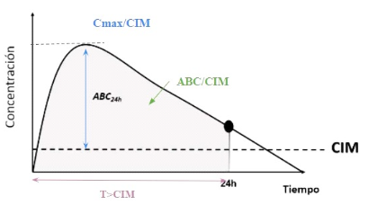 Figura 8. Representación de los índices farmacocinéticos / farmacodinámicos (PK/ PD) asociados a la eficacia de los antimicrobianos in vivo. Leyenda: CIM. Concentración inhibitoria mínima; ABC. Área bajo la curva; Cmax. Concentración máxima de fármaco en plasma; T>CIM. Tiempo en que la concentración del fármaco estuvo por encima de la CIM; ABC/CIM. Área bajo la curva de concentración-tiempo durante 24 horas dividida por la CIM; Cmax/CIM. Concentración máxima dividida por CIM. Si no está presente un subíndice que indique otro periodo de tiempo, se supone que el ABC es de 24 h.