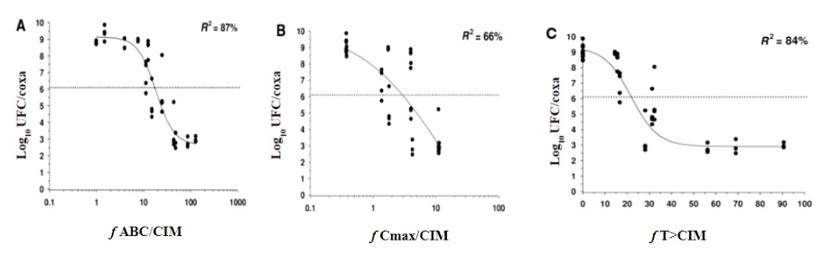 Figura 9. Representación del cociente colistina y P. aeruginosa para cada uno de los índices PK/PD. Leyenda: Las líneas representan el ajuste de las funciones sigmoideas Emax para cada uno de los índices PK/PD: A) ABC. Área bajo la curva de concentración-tiempo dividida por la concentración inhibitoria mínima (CIM), B) Cmax/CIM. Concentración máxima dividida por CIM y C) T>CIM Tiempo en que la concentración del fármaco estuvo por encima de CIM; f. fracción libre. Para cada uno de los índices PK/PD, se presentó el coeficiente de regresión (R2).