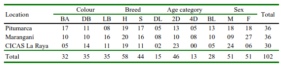 Table 1. Number of alpacas sampled according to colour, breed, age and sex from Pitumarca, Maranganí and CICAS La Raya (Cusco, Peru)