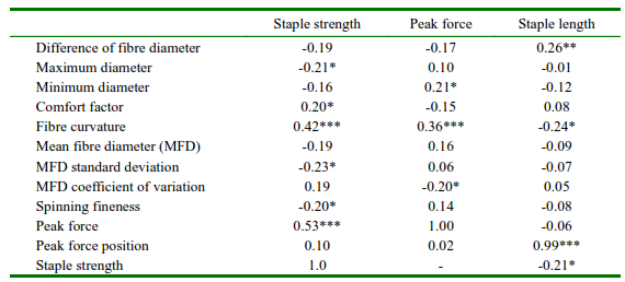 There was a negative correlation between the staple strength with the fibre maximum diameter profile (rs = -0.21) and with the MFD standard deviation (rs = -0.23). In this regard, Quispe et al. (2021) indicate that the fibre diameter profile for annual growth (seasonal variation) is approximated by the maximum, minimum diameter along the staple and the difference in these diameters. Therefore, the positive correlation of 0.24 (p<0.05) between peak force position and difference of fibre diameters, is relevant to improve at the same time staple strength and fibre diameter profile.
