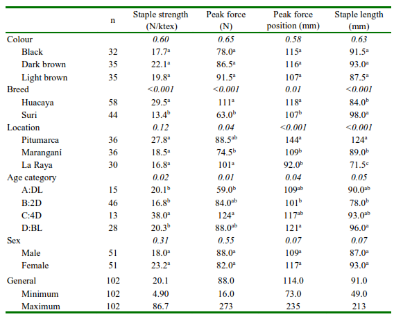 The colour of the fleece, the location and the sex of the alpaca did not influence the staple strength (p>0.05). In the case of Huacaya alpacas, the staple strength and the peak force were higher than those of Suri alpacas. Likewise, staple strength increases with age, between 16.75 and 20.10 N/ktex for young (milk teeth and 2-teeth categories) and 38 N/ktex for 4-teeth category. However, the staple length in Huacaya was shorter compared to Suri (Table 3).