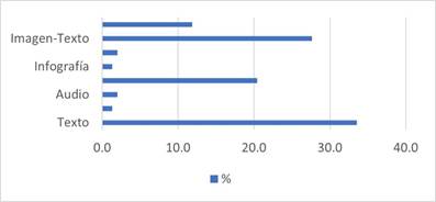 El formato más recurrente en la muestra fue el texto (33.6%; n=51), seguido de la combinación imagen-texto con el 27.6% (n=42); el video, con 20.4% (n=31) y el vídeo acompañado de texto con el 11.8% (n=18). Otros formatos tuvieron una recurrencia mucho menor, inferior al 2 %, tal y como se muestra en la Figura 1.