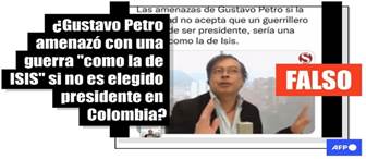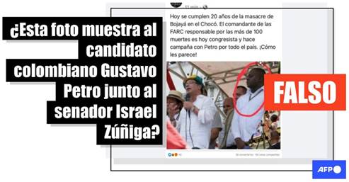 Nota: La fotografía muestra al candidato Gustavo Petro, supuestamente acompañado del exguerrillero y senador Israel Zúñiga, conocido como “Benkos Biohó” y vinculado a la masacre de Bojayá. La foto es real, pero el hombre de la imagen no es Zúñiga, sino un agente de la policía colombiana.