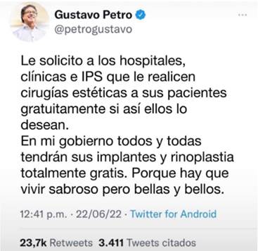 Nota: Una búsqueda avanzada desde el Twitter de Petro (@petrogustavo) con las palabras “cirugías estéticas” muestra que de los dos trinos que ha publicado usando esos términos ninguno corresponde al que se ve en la imagen.