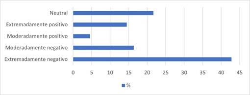 La orientación semántica predominante (véase la Figura 5) en el análisis de los mensajes fue negativa. Aquellos clasificados como extremadamente negativos fueron el 42.8% (n=65) y los moderadamente negativos fueron el 16.4% (n=25), lo cual equivale al 59.2% de la muestra, la cual adoptó una orientación semántica negativa. Los mensajes clasificados como neutrales fueron el 21.7% (n=33). Finalmente, aquellos contenidos con una orientación semántica clasificada como positiva representaron el 19.1% (n=29), siendo el 14.5% extremadamente positivos y el 4.6% moderadamente positivos. Estos resultados permiten demostrar la predominancia de la negatividad en el mensaje político enmarcado dentro del contexto de la desinformación.