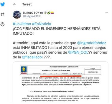 Nota: Las publicaciones en redes sociales afirmaron que el político Rodolfo Hernández fue inhabilitado para ejercer cargos públicos hasta el 2023. Hubo una acusación de corrupción en su contra por parte de la Fiscalía, pero la acción no fue definitiva y, por lo tanto, podría participar en las elecciones. El contenido incluye una captura de pantalla de un documento judicial de 2017.