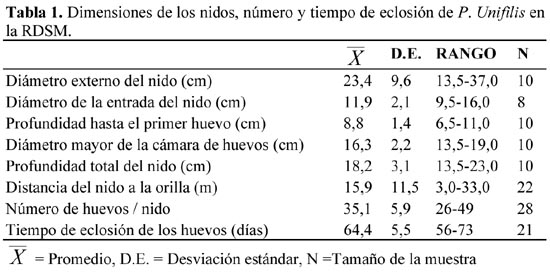 El propósito de este estudio fue colectar información básica sobre el periodo de nidificación y eclosión, y cuantificar la pérdida de nidos y la sobrevivencia de embriones de P. unifilis en la RDSM. Esto ayudará en el futuro a planificar estudios más detallados sobre la ecología de esta especie.
