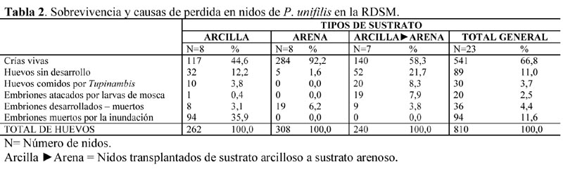 Del total de huevos incubados, 66.8% eclosionaron. El porcentaje de crías fue mayor en nidos dejados intactos en sustrato arenoso (92.2%), que en nidos transplantados (58.3%) y nidos dejados intactos en sustrato arcilloso (44.6%) (Tabla 2). La prueba de Tukey evidencia diferencia estadísticamente significativa con relación a la cantidad de crías obtenidas en función del tipo de sustrato (p<0.05).