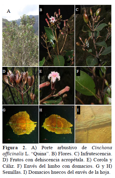Cinchona officinalis se caracteriza por su porte arbustivo (≤ 6 m), con ramas pubérulas cuando son juveniles y glabras a subglabras cuando son adultas, estípulas interpeciolares con coléteres dispuestos en varias filas, hojas elípticas de consistencia coriácea cuando están frescas y cartácea cuando se secan, domacios en el envés de las hojas profusamente huecos con pelos en los márgenes, inflorescencias terminales congestas, cáliz con lóbulos que alcanzan más de la mitad de su longitud, corolas de color rosado con lóbulos densamente vilosos en el interior, cápsulas cilíndricas con dehiscencia acropétala y semillas diminutas aladas de borde entero a ligeramente dentado (Figura 2).