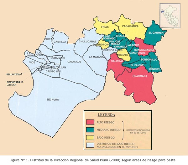 Se consideró como áreas de alto riesgo (áreas con reporte de casos reciente o áreas infectadas), a las localidades pertenecientes a los distritos de Huancabamba, Salitral y Huarmaca; como áreas de mediano riesgo (áreas en silencio epidemiológico o áreas con antecedente epidemiológico de casos de peste sin reportes recientes), a las localidades pertenecientes a los distritos de El Carmen de la Frontera, Sondor, Sondorillo, Canchaque, San Miguel del Faique, Lalaquiz, Chalaco, Santo Domingo, Santa Catalina de Mossa y Yamango; y como áreas de bajo riesgo (áreas sin antecedentes epidemiológicos de peste) a las localidades pertenecientes a los distritos de Morropón, Frias, San Juan de Bigote y Pacaipampa (Figura N° 1).