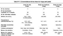 Durante el estudio se capturaron un total de 416 roedores y 24025 pulgas en 80 localidades de las provincias de Morropón, Ayabaca y Huancabamba del departamento de Piura. 26 localidades pertenecían a 3 distritos considerados como áreas de alto riesgo, para la transmisión de la peste, 44 localidades a 10 distritos considerados como áreas de mediano riesgo y 10 localidades a 4 distritos considerados como áreas de bajo riesgo. En la Tabla N° 1 se describen las características (altitud, temperatura, producción agrícola y crianza de cuyes) de las diferentes áreas de riesgo de peste.
