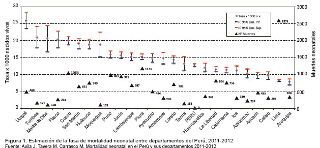 Para el periodo 2011-2012, los departamentos Ucayali, Tumbes, Madre de Dios, Pasco y Cusco registraron las mayores TMN, iguales o superiores a 20 muertes/1000 nacidos vivos; con un riesgo de muerte tres veces mayor que Arequipa y Lima. El mayor número de defunciones neonatales se registró en Lima, Cusco, Puno y Junín con más de 900 defunciones neonatales (Figura 1).