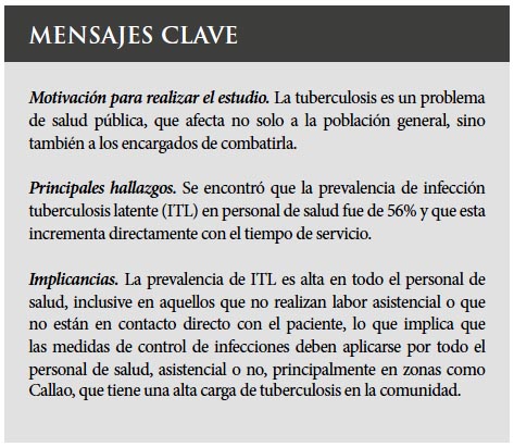 Con el propósito de disponer de información sobre los riesgos para infección por tuberculosis, la Dirección General de Epidemiología del Ministerio de Salud, desarrolló una vigilancia centinela en establecimientos de salud de la Provincia constitucional del Callao, dicha vigilancia incluyó el diagnóstico de infección tuberculosa latente (ITL) mediante la aplicación del método IGRA. El objetivo del presente estudio fue estimar la prevalencia de ITL en trabajadores de salud de un área con alta carga de enfermedad de tuberculosis. La prevalencia de ITL en trabajadores de salud fue 56%. En trabajadores con más de 10 años de servicio la prevalencia se incrementó a 63% y en trabajadores con más de 35 años de servicio se encontraron prevalencias entre 58 y 60%. Existe una alta prevalencia de ITL en trabajadores de salud de establecimientos del primer nivel de atención, identificándose al mayor tiempo de servicio, como uno de los principales factores de riesgo.