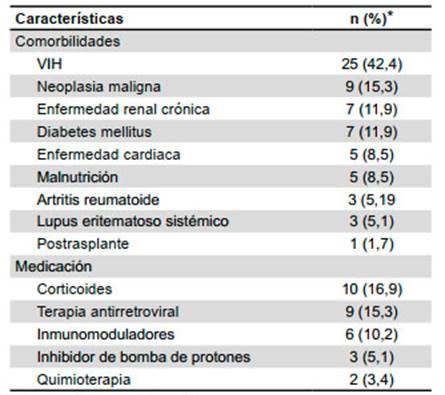 De los 70 casos de infección invasiva, se revisaron 59 historias clínicas. El 89,8% correspondían a Salmonella sp. y 10,2% a Salmonella Typhi/Paratyphi. Los síntomas más frecuentes fueron fiebre (66,1%), diarrea y trastorno del sensorio (40,7% cada uno). En cuanto a las comorbilidades, la más frecuente fue la infección por el VIH con 42,4%, seguida de neoplasia/malignidad (15,2%), enfermedad renal crónica (ERC) y diabetes mellitus con 11,8% cada una. La medicación concomitante más frecuentemente identificada fue corticoides (16,9%), seguida de terapia antiretroviral de gran actividad (TARGA) (15,3%), e inmunomoduladores (10,2%) (Tabla 1).