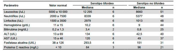 Los pacientes con Salmonella Typhi cursaron más frecuentemente con anemia, perfil hepático alterado y leucocitosis con neutrofilia. En salmonelosis invasiva causada por salmonela no tifoidea, los pacientes cursaron con anemia, fosfatasa alcalina elevada, recuento normal de leucocitos y de neutrófilos con linfopenia (Tabla 2).
