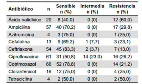 Se encontró que el antibiótico con mayor susceptibilidad fue ceftriaxona (83,3%), seguido por cotrimoxazol (78,8%) y cloranfenicol (75,0%). En el caso particular de ciprofloxacino, la susceptibilidad fue 50,8%. Además, la susceptibilidad intermedia presentada por este antibiótico fue la mayor respecto a los demás antibióticos analizados (23% en enfermedad invasiva) (Tabla 3).