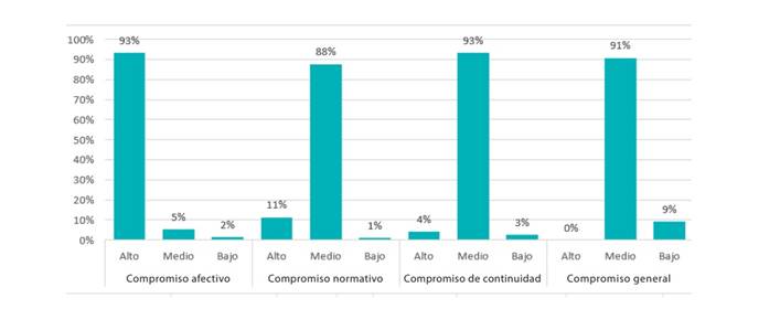 En el análisis descriptivo del compromiso organizacional, se evidenció que el 91 % de los médicos estaban comprometidos con la institución durante la pandemia. Con respecto a sus dimensiones, el 93% de los médicos mostraron compromiso en las dimensiones afectiva y de continuidad, mientras que el compromiso normativo fue del 88 % (Figura 1).