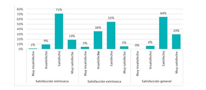 En el análisis descriptivo de satisfacción laboral, los médicos se encontraron satisfechos con la atención de pacientes con COVID-19, 71 % en la dimensión intrínseca, 55 % en la dimensión extrínseca, 64 % en la dimensión global (Figura 2).