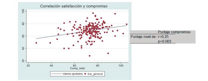 Aunque no hubo ninguna persona que mostrara un nivel alto de compromiso, se observó p = 0,003, lo que indica una correlación positiva y significativa entre el nivel de satisfacción y el nivel de compromiso reportado. Asimismo, al explorar los valores numéricos de las variables principales, se observó una correlación de Pearson (r = 0,25) significativa (p < 0,05), lo que indica que existe una relación positiva entre la satisfacción y el compromiso organizacional; es decir, a mayor puntaje de satisfacción, también tiende a haber un mayor puntaje de compromiso organizacional (Figura 3).