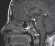 Figura 1 RNM de hipófisis con contraste (gadolinio), corte sagital: adenohipófisis disminuida de altura sin lesiones focales