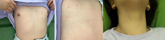 La paciente acudió al hospital porque, de forma insidiosa, tres días antes de su ingreso presentó fiebre, disnea y poliartralgias luego de regresar de un viaje de una semana a una ciudad al norte del país. Dos días antes de su ingreso presentó cefalea holocraneana y un día antes, vómitos, fiebre y cefalea. Al examen físico se obtuvo lo siguiente: PA: 116/64, FC: 92, FR: 16, T°: 37,1. En la piel resaltó palidez moderada; por otro lado, se observó el cuello ancho. Las mamas eran de aspecto infantil, mientras que hubo ausencia de vello axilar y púbico. En el aparato cardiovascular, los ruidos cardiacos fueron regulares, sin soplos, taquicárdicos. El abdomen y el aparato respiratorio no presentaron alteraciones. En cuanto al aspecto neurológico, despierta, lúcida, poco interactiva. Los ojos presentan nistagmo oscilatorio.