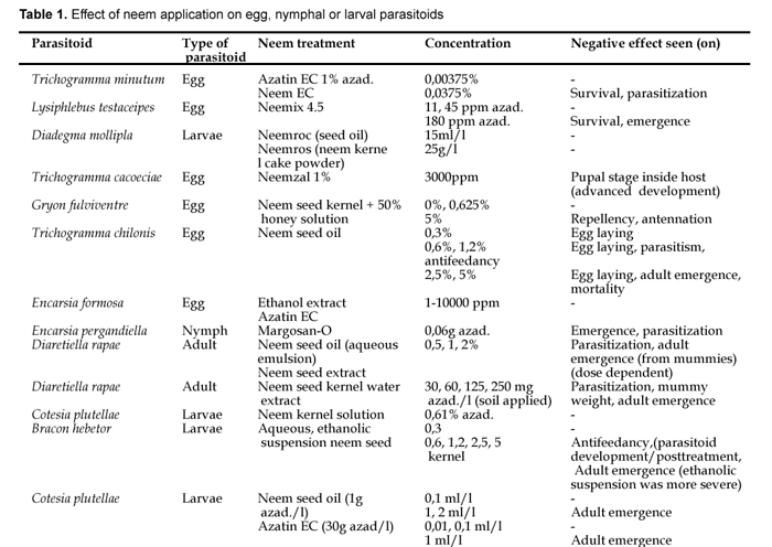Adult emergence, parasitization, mortality and antifeedancy are the most important parameters when assesing the effects of neem on parasitoids. There is a minimal impact of neem on parasitoids if applied in low doses or commonly field applied doses. Aqueous-neem suspensions are less toxic than neem oil extracts. The timing of application (host stage) plays an important role in order not to affect the parasitoids. Field experiments are more relevant for assessing the effect of neem.