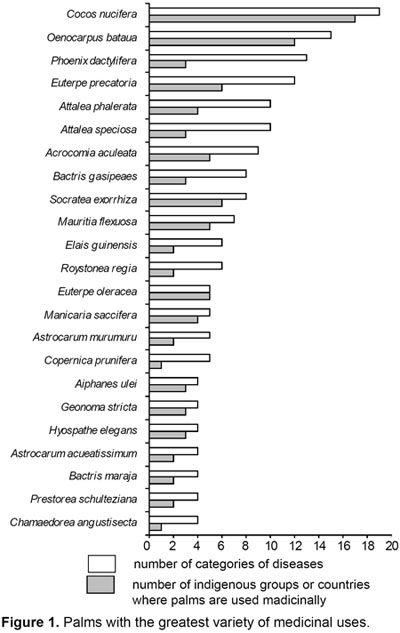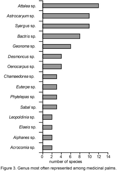Often several species in the same genus are used for medicinal purposes (Fig. 3). The genus Attalea has 12 medicinal species, followed by Astrocaryum and Syagrus each with 10 different species with medicinal uses each. As expected species from the same genus often have similar uses, but there are exceptions to this rule; Oenocarpus bataua prevent fever (Plotkin & Balick, 1984) but Oenocarpus bacaba can be harmful to a person recovering from intermittent fever (Bourdy et al., 2000). Obviously most medicinal uses of palms are beneficial, but like many other drugs, inappropriate use may be harmful. For instance, a beverage of Oenocarpus bataua fruits, is said to quickly cause a "horrible death" if mixed with liver of tapir (Balick, 1986).