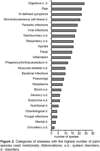 In a study of indigenous people in Mexico the most frequent health problems treated with natural medicaments were gastrointestinal disorders, respiratory illnesses, infected wounds and other inflammatory dermatological diseases (Heinrich, 2000). We have used a different classification of diseases (Cook, 1995), and our data originate from a more extensive territory, and we look only at health conditions treated by plants from a single plant family, but still as in the Mexican study digestive system disorders remains the most frequent ailment (Fig. 1). Circulatory system disorders which are one of the main health problems in western civilization, seem not to be important in traditional American medicine treated with palms. The preponderance of pain, injuries, muscularsceletar system disorders, and poisonous stings that can be treated with palm medicines could be a reflection of the hard living conditions of many indigenous American people. Emergency medicine include some that are derived from palms, especially medicines with stypic properties such as those derived from Attalea speciosa and used by the Apinayé and Guajajara Indians of northeastern Brazil (Balick, 1986). Among the Warao and Arawak of Guyana Euterpe oleracea is considered useful as a stypic medicine when somebody is far away in the forest (Andel, 2000).