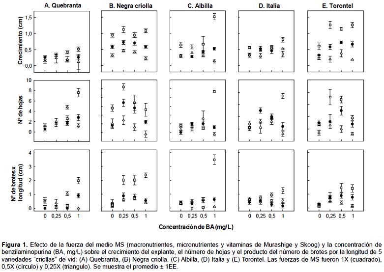 Se ha reportado que la disminución de la fuerza del medio MS puede aumentar el número de brotes en algunas especies y por ello suele probarse su efecto en los experimentos de optimización de medios (Frett 1987). Si bien en el caso de las variedades Negra Criolla y Torontel la disminución de la fuerza del medio MS tuvo un efecto en el número de brotes (datos no mostrados y producto del número de brotes por la longitud de los mismos), el efecto fue opuesto al reportado, es decir, se observó un mayor número de brotes conforme mayor era la fuerza del medio. En cuanto al uso de citoquininas como la BA, su efecto en la proliferación de brotes axilares ha sido demostrado en múltiples trabajos de propagación in vitro (van Staden et al. 2008). En general, las variedades "criollas" con las que hemos trabajado mostraron un mayor número de brotes con la concentración más alta de BA (1 mg/L), con excepción de los casos ya señalados de las variedades Negra Criolla y Torontel. No obstante, debemos señalar que cuando la fuerza del medio MS fue menor a 1X, el efecto de dicha concentración de BA en el número de brotes no fue evidente, lo que sugiere una fuerte dependencia de la respuesta a BA en relación a la fuerza del medio en estas variedades de vid. En su conjunto, estos hallazgos confirman la complejidad de la respuesta de las distintas especies o variedades a las variaciones en la composición del medio y la dificultad para establecer patrones generales.