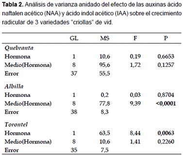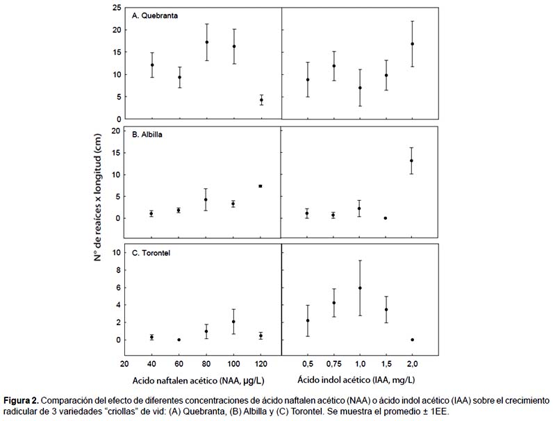 En términos generales, se obtuvieron mejores resultados con IAA en 2 de las 3 variedades estudiadas (Albilla y Torontel); en la variedad Quebranta, el desempeño con las 2 hormonas fue comparable (Fig. 2 y Tabla 2). Cabe señalar que los mejores resultados con IAA en las variedades Quebranta y Torontel se obtuvieron con una concentración que fue el doble de la que se suele utilizar (1 mg/mL). A diferencia del NAA, que es una auxina sintética muy estable en el medio de cultivo, el IAA es una auxina natural cuya concentración tiende a caer al oxidarse bajo condiciones de cultivo. Esta propiedad ha sido aprovechada en casos como el enraizamiento de micro-cortes de manzana, en el que se ha determinado que la formación de las raíces requiere concentraciones de auxina mayores que las que requiere el posterior crecimiento de las mismas (Machakova et al. 2008). Nuestros resultados sugieren que un fenómeno similar podría ocurrir con las variedades "criollas" de vid evaluadas.
