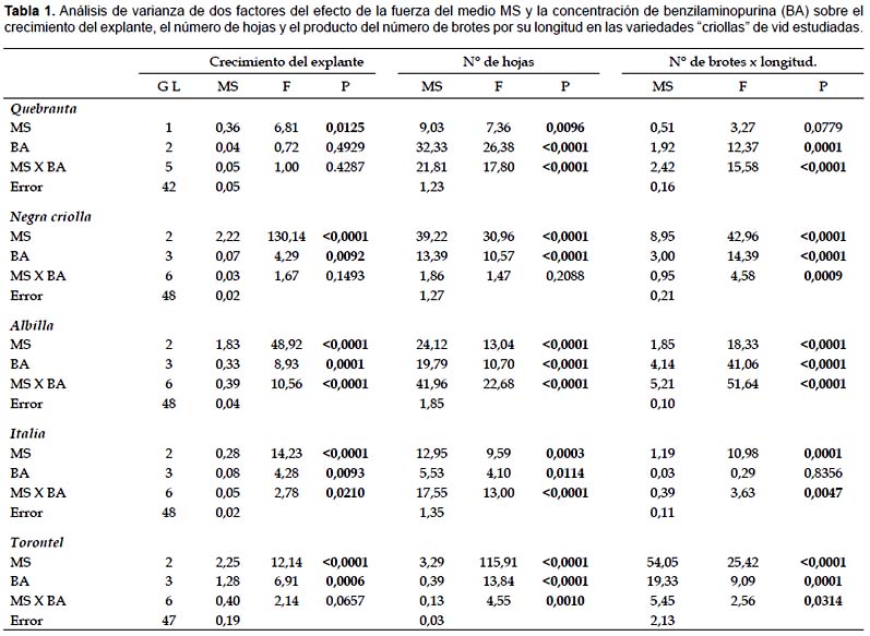 Nuestros resultados permiten concluir que para las variedades Quebranta, Albilla e Italia, el medio óptimo de propagación fue el estándar (medio 1), en tanto el medio 3 lo fue para la variedad Negra Criolla y el medio 2 para la variedad Torontel. Si bien la contaminación de los fragmentos nos impidió tener resultados para el medio 7 en la variedad Quebranta, mediciones hechas antes de que ocurriera la contaminación (20 días luego de iniciado el experimento) revelaban ya una menor eficacia en relación al medio estándar (datos no mostrados). Se debe enfatizar también que no se han considerado medios de propagación con fuerza de medio MS o concentraciones de BA superiores a las del medio estándar por 2 razones: (1) está reportado que medios de cultivo con alto contenido de sales suelen estar asociados a la formación de tejidos rígidos y de formas distorsionadas (vitrificación) y que las concentraciones altas de BA promueven una formación no deseada de callos (Sim 2006); y (2) en experimentos preliminares hechos en nuestro laboratorio con la variedad Quebranta se encontró que el crecimiento en medios con 2X MS, 2 mg/L de BA o ambos a la vez , era muy pobre en relación al medio estándar (datos no mostrados).