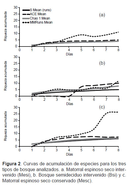 El número de especies de los tres sitios difiere tan solo por una o dos especies entre sí (Tabla 1), sin embargo se obtuvieron marcadas diferencias en la abundancia (Tabla 2). El número de murciélagos capturados en el Mesi y el Mesc duplican la abundancia de Bsi (Tabla 2). La riqueza de especies presentan una completitud de muestreo entre el 36.2% y el 100% para el Mesi y su riqueza observada se ajustó a la predicción del estimador Chao 1 (Fig. 2a). En el Bsi se obtuvo una completitud entre el 43% y el 64.5% (Fig. 2b), mientras que para el Mesc tuvo un intervalo entre el 22.7% y el 92.6% (Fig. 2c).