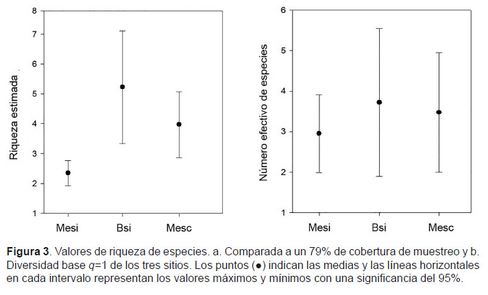 Con respecto a la diversidad en base a q=1 no se observan diferencias significativas entre los tres tipos de vegetación (Tabla 3, Fig. 3b). El Bsi fue el sitio más diverso con 3.7 especies efectivas. El Mesi presentó una diversidad expresada como 2.9 especies efectivas, los intervalos de confianza son bastante amplios debido a las bajas abundancias. La diversidad total de murciélagos presenta valores de 5.27 y 3.95 especies efectivas para q=1 y q=2 respectivamente (Tabla 3).