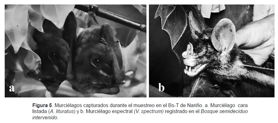 En el Mesi y el Bsi los ensamblajes de murciélagos estan dominados por especies de los murciélagos nómadas de Artibeus. Estos son murciélagos generalistas que recorren grandes distancias en busca de alimento. Su presencia en bosques de baja productividad se debe a la disponibilidad de frutos de cultivos y según Tirira (2007) a que utilizan el dosel bajo para moverse entre parches de alimentación probablemente ubicados en zonas más húmedas. En sitios con cultivos de mango, almendro, limón y mandarina se detectaron refugios de A. lituratus y P. discolor, esto puede ser un indició de la capacidad de las tres especies para soportar el deterioro y remplazamiento de su hábitat natural.