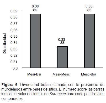 En cuanto a diversidad beta, aunque los tres sitios presentaron especies exclusivas, el recambio no es lo suficientemente alto para considerar que son ensamblajes diferentes. Un mayor esfuerzo de muestreo es necesario para corroborar la estructura del ensamblaje de murciélagos y determinar si realmente integran uno solo.