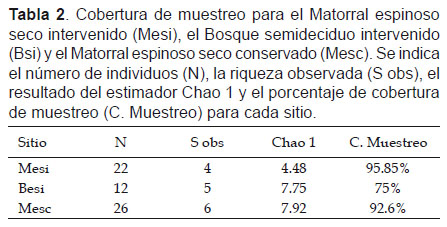 Para una localidad cercana al Bsi y el Mesi denominada Remolino con vegetación de los dos tipos, se ha propuesto que es necesario un total de 42 noches de muestreo para reportar la mayoría de las especies esperadas (Sánchez et al. 2007). Lo anterior concuerda con los estimadores de riqueza analizados, que sugieren la necesidad de un mayor esfuerzo de muestreo. Por ejemplo para el Bsi el esfuerzo de muestreo permitió registrar el 75% de la riqueza esperada de murciélagos, así que se esperarían otras dos especies con el mismo esfuerzo de muestreo. En el caso del Mesc se esperaría al menos otra especie, es decir con un mayor esfuerzo de muestreo en los dos tipos de vegetación probablemente se podría alcanzar una riqueza similar. Esto brinda limitadas evidencias que hacen suponer que los dos tipos de tipo de vegetación tienen similar estado de intervención y que las pocas diferencias en las riquezas no se deben a diferencias en el tipo de vegetación.
