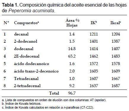 Composición química.-Del proceso de hidrodestilación se obtuvieron 3 mL del aceite esencial de P. acuminata con un rendimiento de 0.4%. El análisis de CG-EM permitió identificar ocho compuestos químicos, cinco de ellos fueron aldehídos, un alcohol y dos ácidos carboxílicos. En la Tabla 1, se muestran los datos obtenidos para los compuestos presentes en el aceite esencial de P. acuminata. Este es el primer reporte sobre la composición química del aceite esencial esta especie.