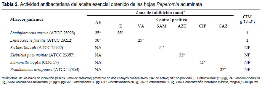 Actividad antibacteriana.- El aceite esencial de P. acuminata presentó actividad antimicrobiana frente a las bacterias Gram positivas (Tabla 2). El aceite inhibió el crecimiento de S. aureus (ATCC 25923) con un halo de inhibición de 35 mm equivalente al producido por la Eritromicina (control). Para E. faecalis (ATCC 29212) produjo un halo de 30 mm, mayor de lo que produce la Vancomicina (control). La concentración inhibitoria mínima (CIM) fue de 1 μL/mL para ambos microorganismos.