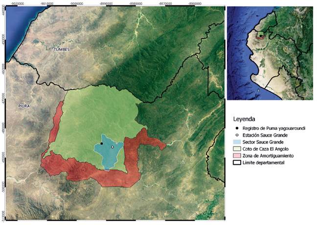 Figura 1 Mapa de la localidad de registro fotográfico de Puma yagouaroundi en el sector Sauce Grande, Coto de Caza El Angolo, Piura, Perú.