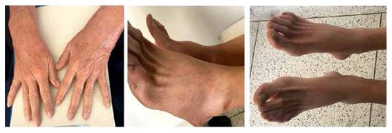 Imagen 1: Se observa compromiso poliarticular en enfermedad gonocócica diseminada. A. Compromiso con sinovitis en metacarpofalángicas y muñeca, B y C: Compromiso de sinovitis con edema en tobillos.